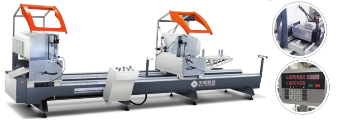 ☆?兩鋸頭即可單獨工作,也可同時工作,同時工作時,能一次切出所需要的長度及型材兩端角度。