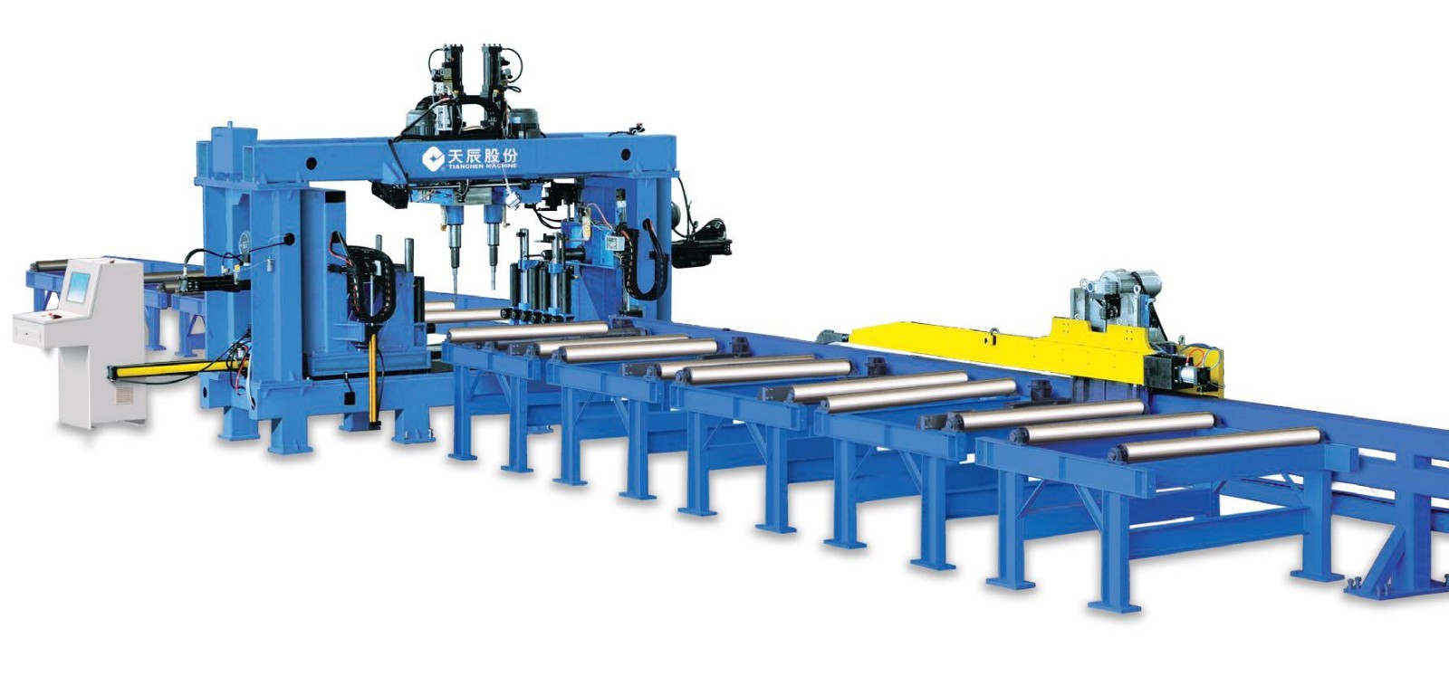 本機床主要用于對H型鋼、槽鋼、方管和矩形管等型鋼進行鉆孔加工,它主要應用于鋼結(jié)構(gòu)建筑、橋梁、電站、海洋石油井平臺、塔桅等鋼結(jié)構(gòu)行業(yè)。機床一共采用4個主軸: 左單元和右單元各有1個主軸分別對型鋼的兩個翼板進行鉆孔加工;上單元有2個主軸,對型鋼的腹板進行鉆孔加工。上單元能裝夾2種不同直徑的鉆頭,可以同時加工腹板上兩種不同直徑的孔。和腹面上只有單個主軸的機床相比,當腹板孔徑變化時不需要手工更換鉆頭,因此該機床大大節(jié)省了換刀時間,顯著提高了加工效率和加工精度。該機床是我公司專利產(chǎn)品